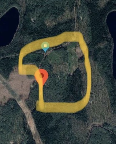 Kartalla kokeen aluetta, laavun ympäristössä. Sininen täppä kartalla on se laavu ja punasen täpän kohdalta lähtee hakurata kohti lampea. Suurinpiirtein tuo keltainen alue